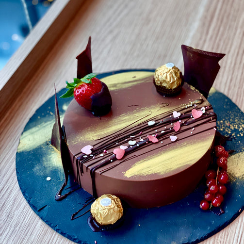 Dieses Herz ist aus zwei Eissorten geschichtet, mit Schokolade überzogen und mit einer aufwendigen Verzierung und Dekoration. Dekofrüchte und Stil können abweichen.